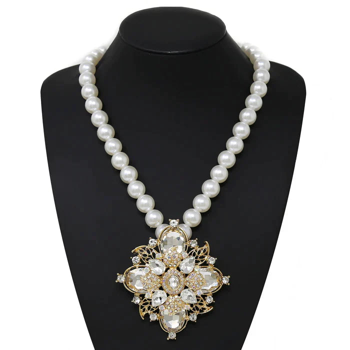Glass Stone Flower Pendant Pearl Beaded Necklace