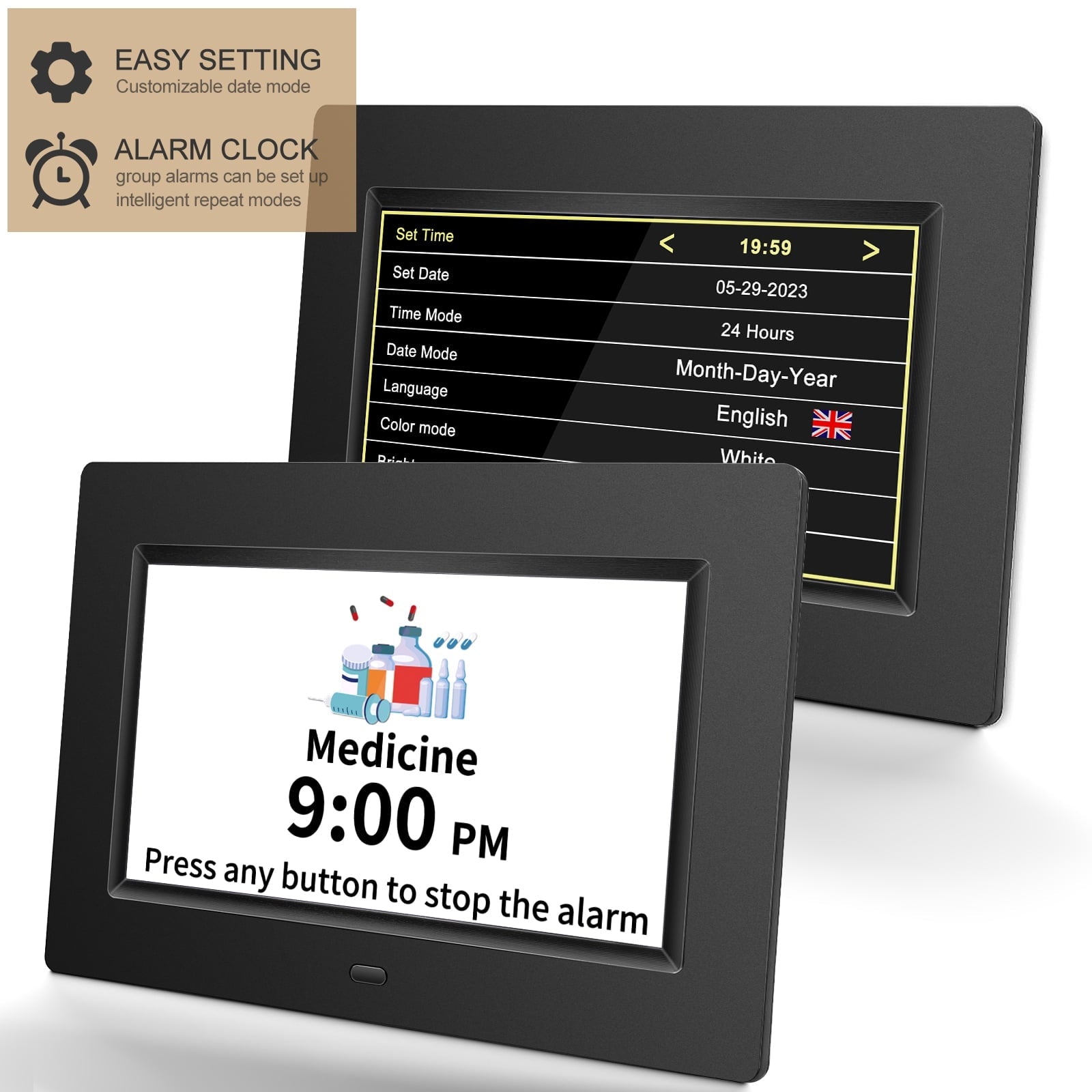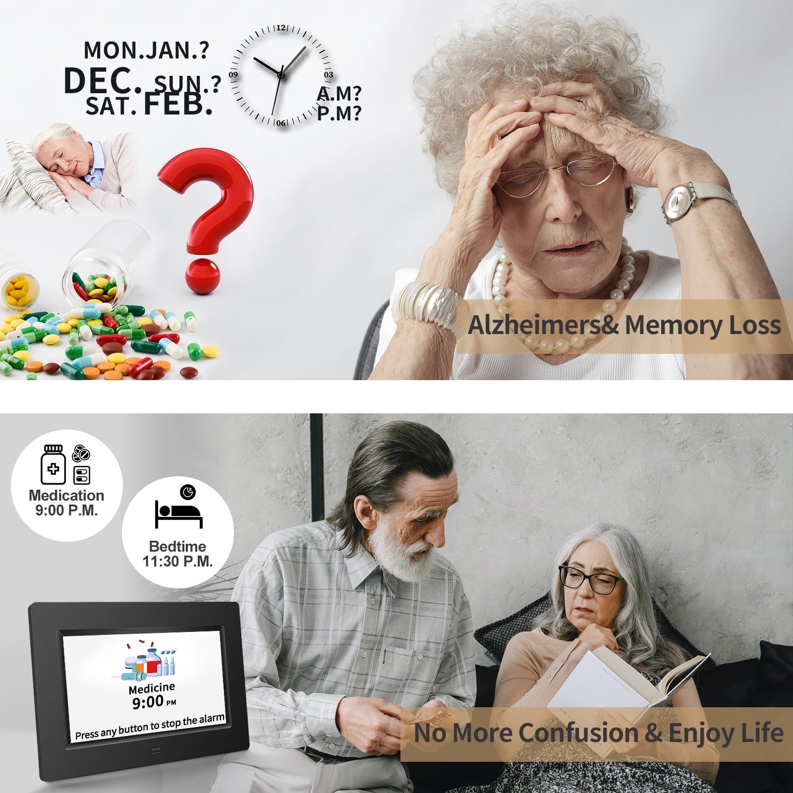 - Set up to 12 different alarm scenarios with 12 labels, such as Mealtime, Medication, Clinic, Shower, and more, to help you stay on track with your daily routine.