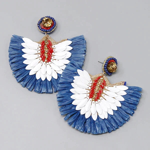 July 4th Raffia Fringed Fan Statement Earrings