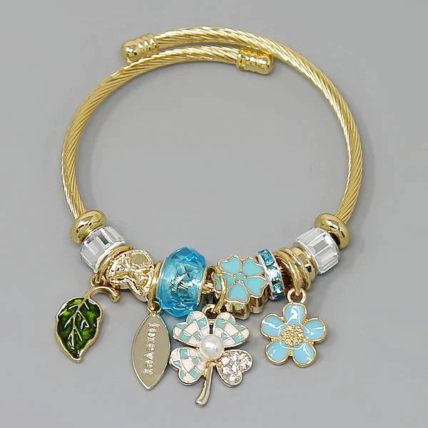 Leaf / Clover / Flower Multi Charm Textured Bangle Bracelet