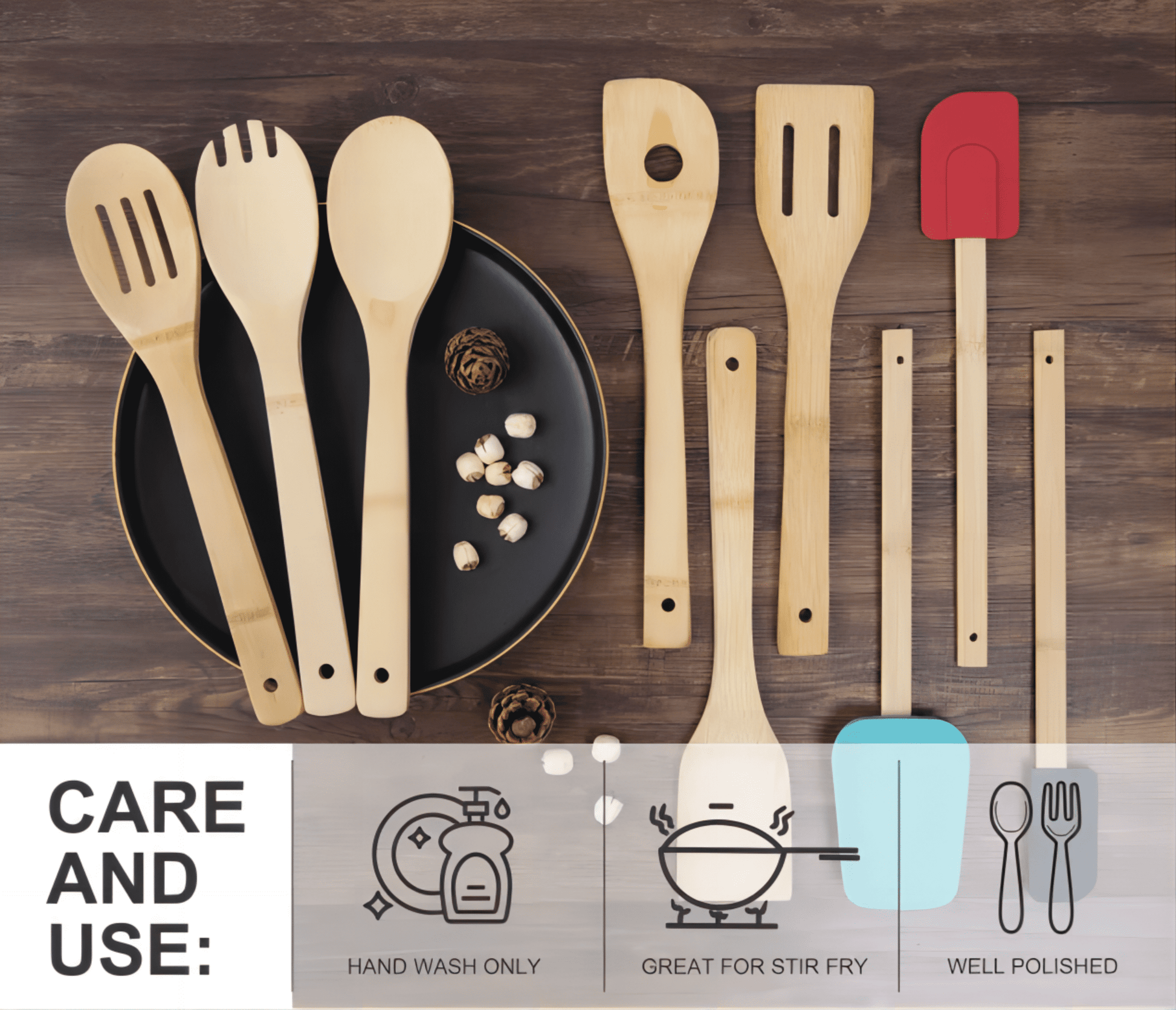 - HIGH-QUALITY MATERIALS: The Mainstays 9 Pieces 100% Bamboo Cooking Utensils Set is made of 100% natural bamboo, and it's also heat and stain-resistant. The bamboo handles have great heat insulation, protecting your hands from scalding.
