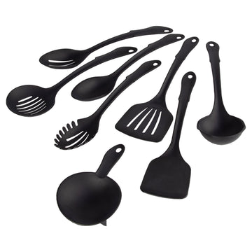 Mainstays 8-Piece Nylon Kitchen Utensil Set includes all the basics you need to cook up delicious meals! The nesting black kitchen set includes a Solid Turner, Large Slotted Turner, Pasta Server, Solid Basting Spoon, Slotted Spoon, Skimmer, Ladle, and Spoon Rest, plus a connector ring to keep the set together. Each utensil is durable and heat resistant to 400 degrees F. And the entire set is dishwasher safe so clean-up is easy! Get cooking with this essentials kit.