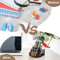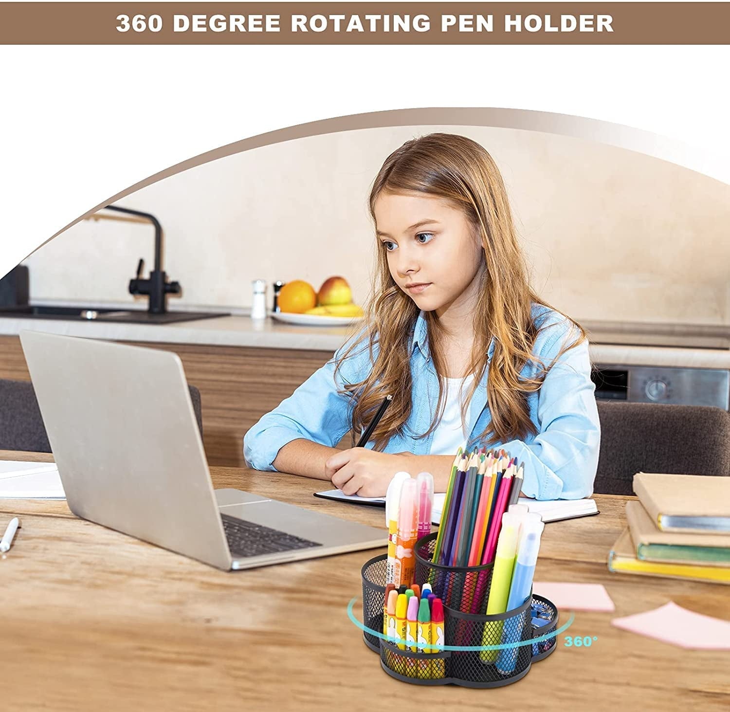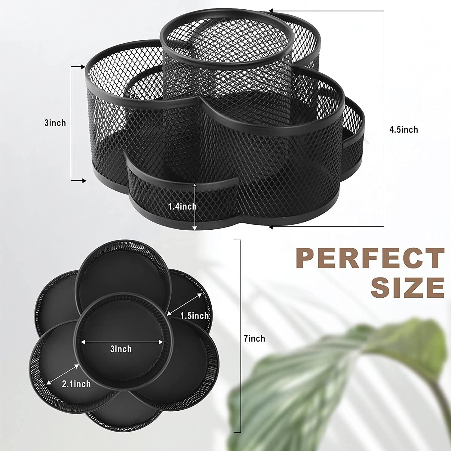 - 【ALL IN ONE ORGANIZER】As office supplies storage and pen and pencil organizer. You can use it for storage supplies such as pens, pencils, markers, clips, scissors, art supplies, remote controls, brushes, etc. The desk caddy spins smoothly. You can always get what you want quickly and easily.