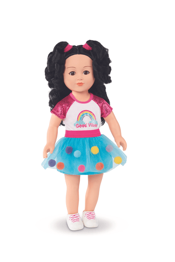 Add some good vibes to your life the My Life As Quinn Posable 18-inch doll! She has warm brown eyes that open and close, and her long, wavy black hair looks so cute styled in her two pink ponytails! Quinn is wearing a stylish outfit that features a t-shirt with pink printed sequin sleeves, a rainbow 'good vibes' logo, a bright blue mesh skirt with colorful pom-poms inside, and matching white sneakers with pink laces. As part of the full collection of My Life As Dolls, the Quinn doll provides hours of playtime for any child and makes a wonderful Christmas, Hanukkah, holiday, or birthday present.
