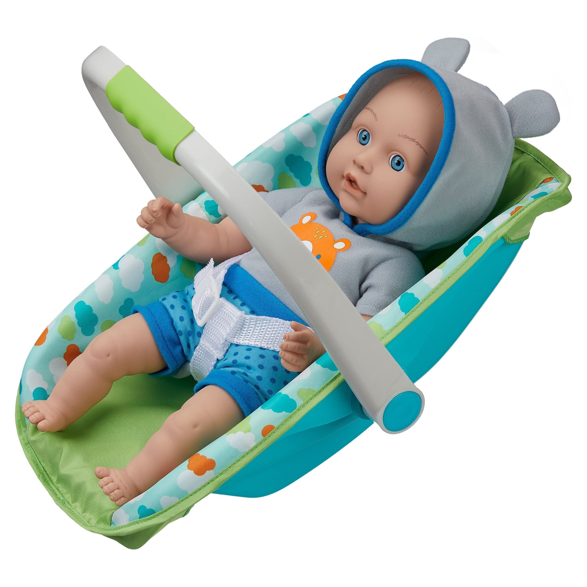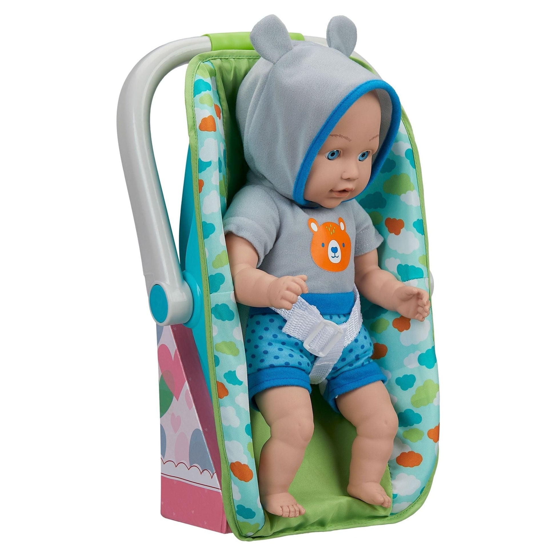 - • Walmart exclusive adorable baby doll with brightly colored, soft knit outfit measures 13" tall • Doll features soft body for cuddling plus a vinyl head, hands, and feet • Includes bright, removable fabric-covered toy car seat with adjustable carry handle