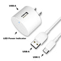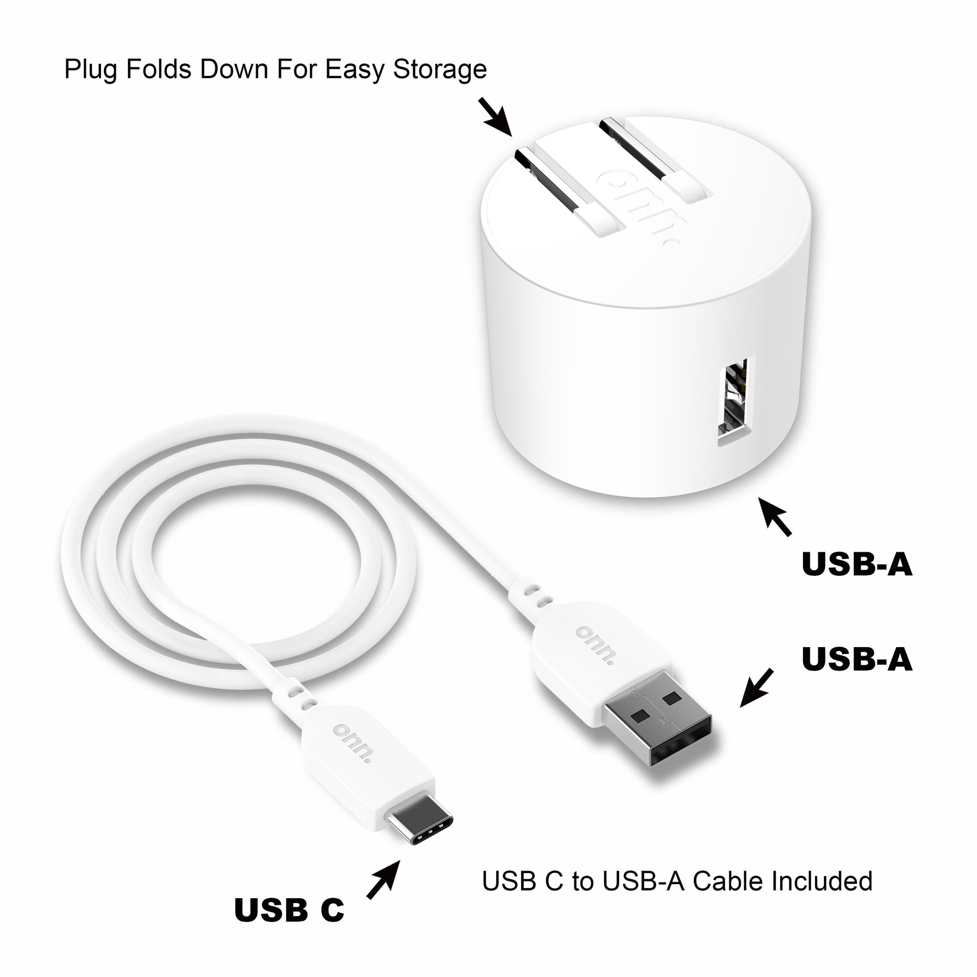 onn. Wall Charging Kit with USB-C to USB Cable, White,cell phone charger,90 degree folding plug,LED power indicator
