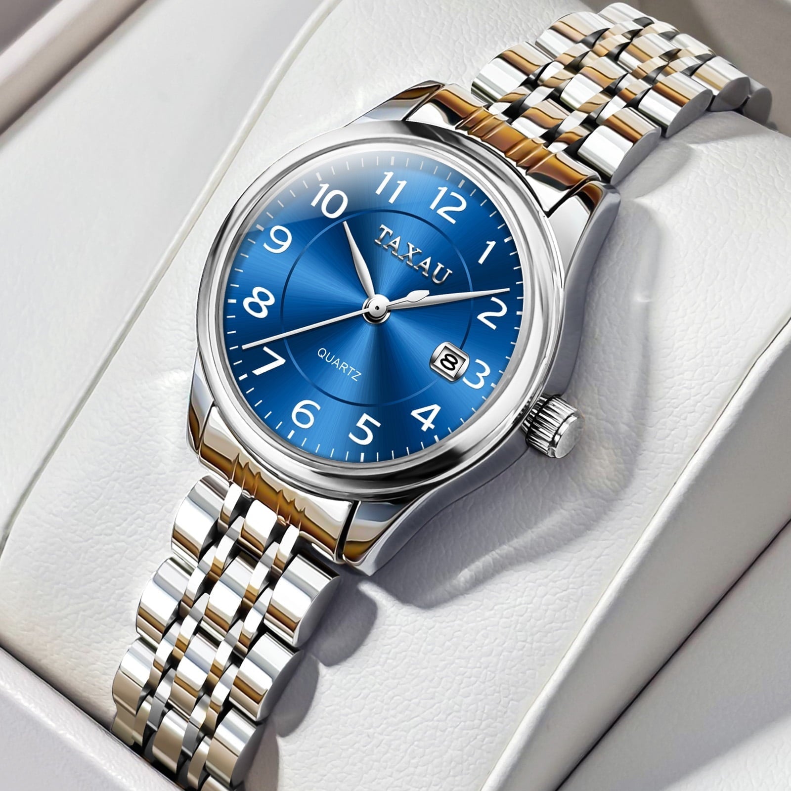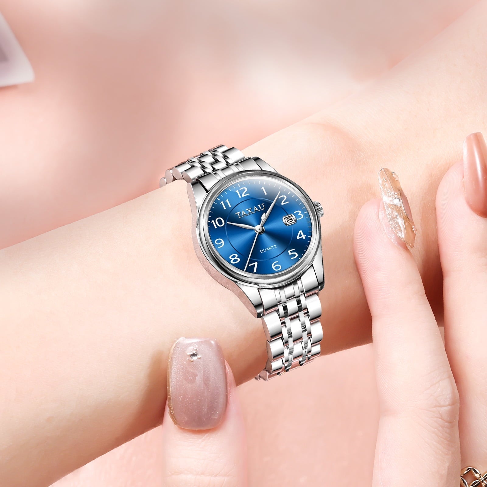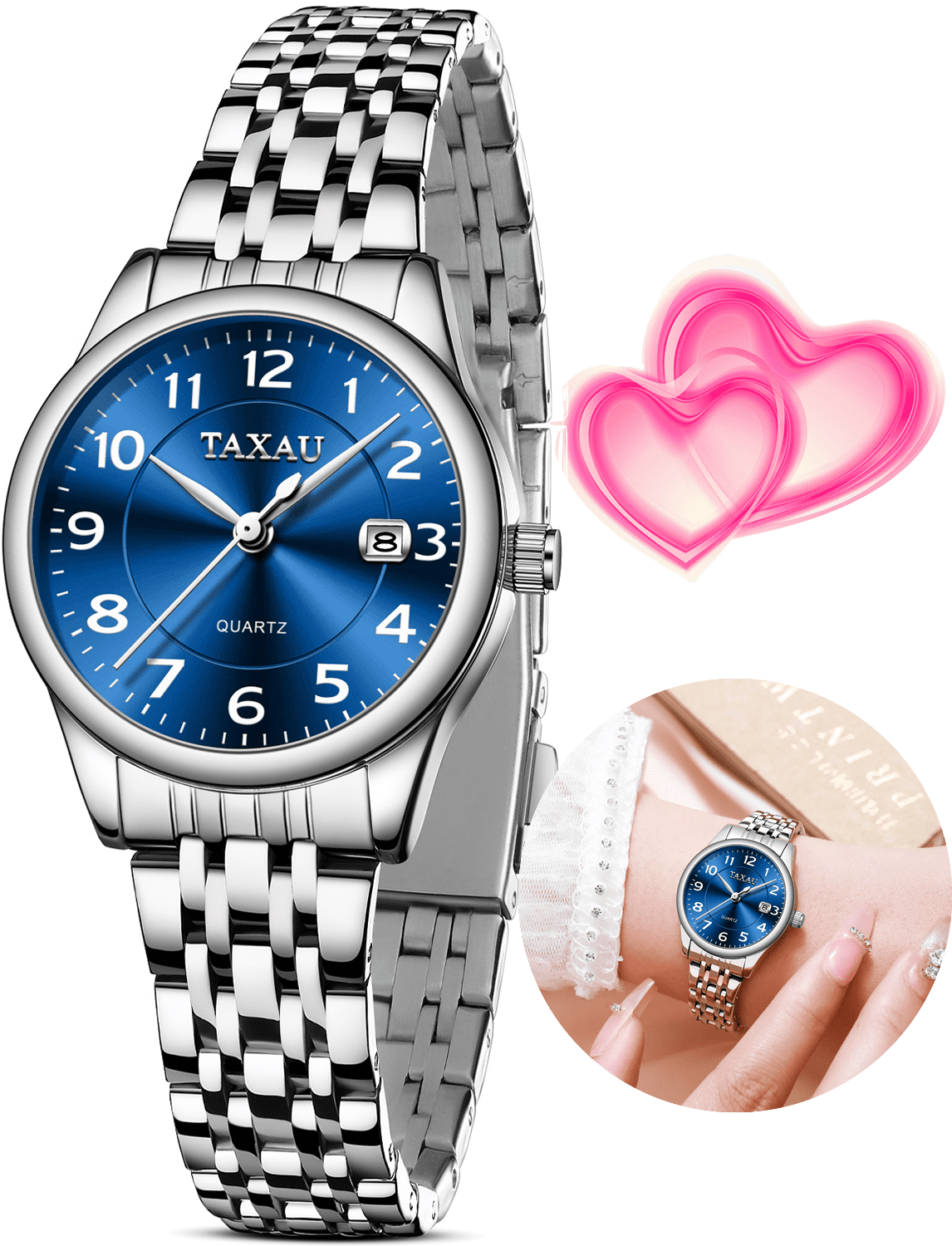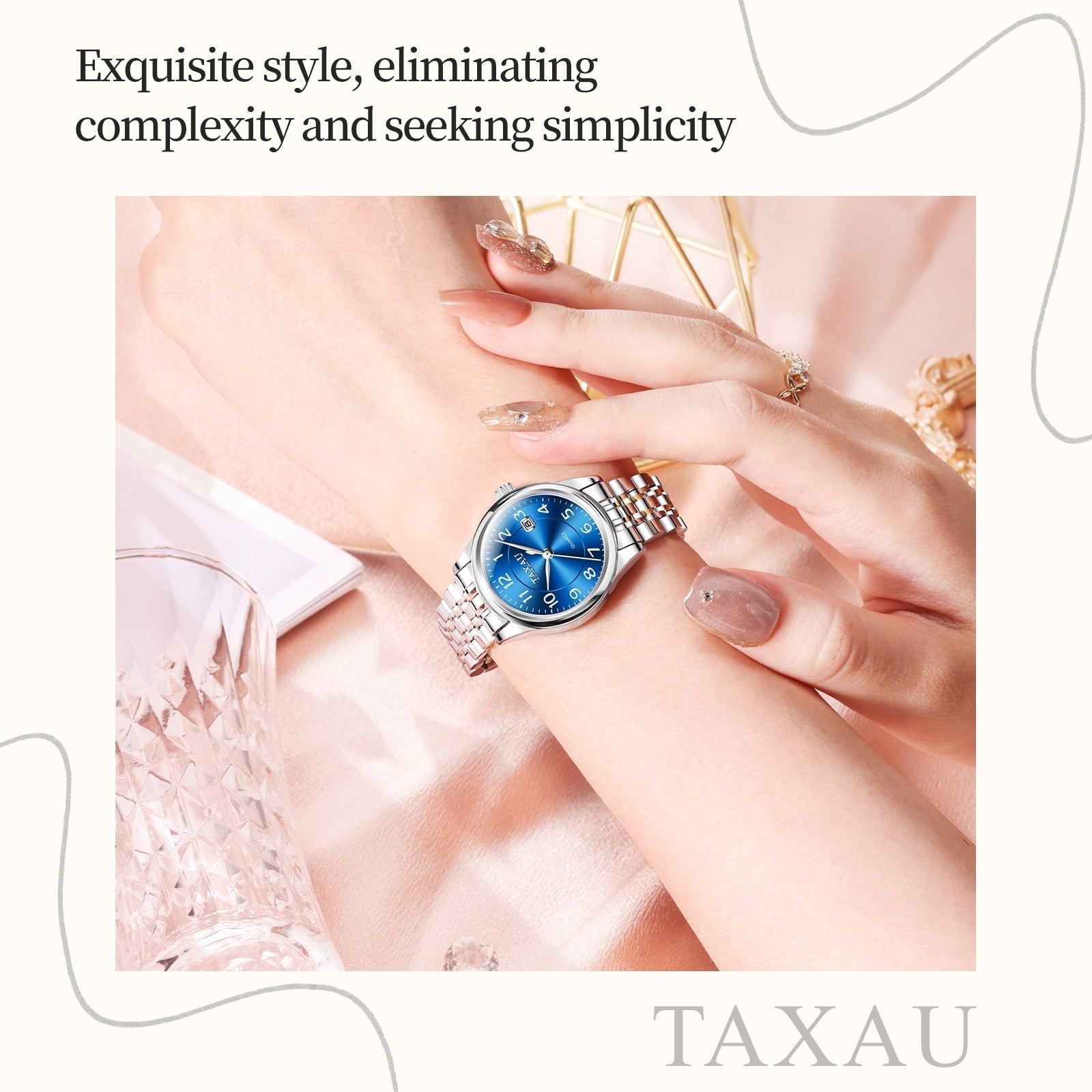 - ?Fashion Elegant Design?TAXAU Fashion Women's Watch, simple yet unique watch design. The blue dial with Arabic numerals and bracelet is a classic and elegant way to accentuate your beauty.Unlike the subdued dial, this watch comes with a shiny silver stainless steel band, which is exquisite and attractive.It is not only comfortable to wear but also very hard-wearing in daily use, so you don't have to worry about it even when you go out.