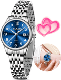 TAXAU Womens Elegant Sliver Watches Classic Date Watches For Women Sliver Stainless Steel Band Watches For Ladies Blue Dial Women Wrist Watches Waterproof Ladies Watches Analog Watches Watches Women