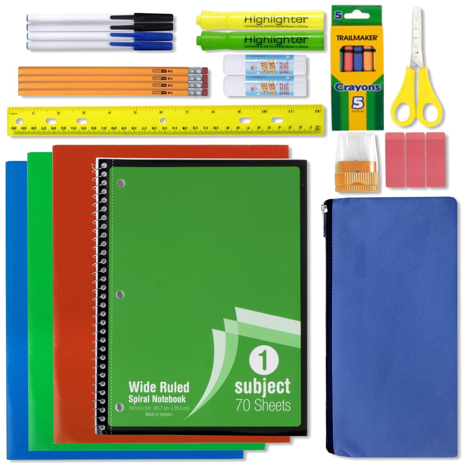 - ESSENTIAL SCHOOL SUPPLIES BUNDLE: This 30 piece school supply kit contains a total of (1) 70 Page Single Subject Spiral Notebook in Assorted Colors, (5) Pens, (5) #2 Pencils, (1) Pack of 5 Crayons in Primary Colors, (3) 2 Pocket Folders in Assorted Colors, (3) Erasers, (2) Highlighters, (2) G. Sticks, (1) 5 Inch Blunt Tip Scissors, (1) 12 Inch Ruler in Assorted Colors, (1) Manual Pencil Sharpener in Assorted Colors and (1) Soft Canvas Pencil Case in Assorted Colors each, all you need in one kit for studying, learning, or teaching!